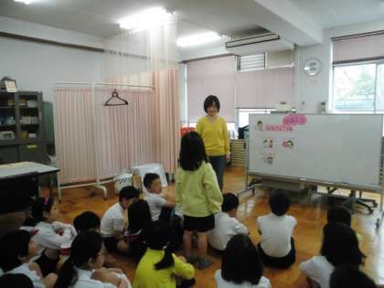 保健室では,4月〜6月にかけて“健康診断”を行います。今週は,最初に保健室での約束を確認したあと,身体計測を行っています。