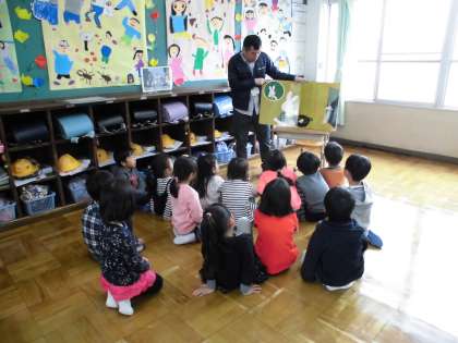 学習の合間にほっと一息,読み聞かせタイムがありました。大型絵本を読み聞かせに耳をかたむかせ,集中して聞いていました。