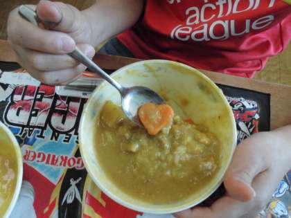 給食が始まって2日目です。今日の献立は「麦ごはん」「ソテー」「チキンカレー」「牛乳」でした。「チキンカレー」には,ラッキー人参が入っていました。