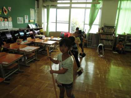 机を動かしたり,ぞうきんで床のからぶきをしたり,ほうきではいたり…。