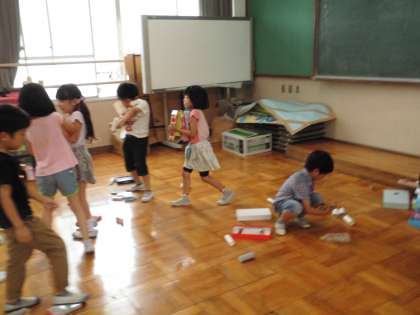 部屋に置いてあるまつぼっくりやコマなどのおもちゃなどに子どもたちは興味津々でしたが,箱を使った活動が始まると,集中して取り組んでいました。