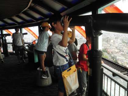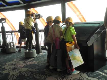 京都タワーの展望台から京都市の様子を見ました。見えている景色はどの方角かな?見えている建物はどこにあるものかな?と,地図帳を広げながら考えました。いいお天気だったため,遠くの方まで見ることができました。