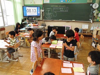 これまでに書き溜めた,あさがおの「はっけんカード」を使って,子どもたちどうしで情報交換をしました。