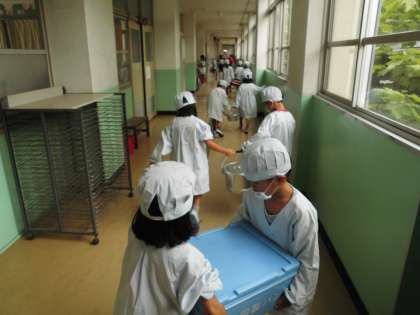 給食室から教室に運ぶときにも,友達と協力して上手に運んでいます。