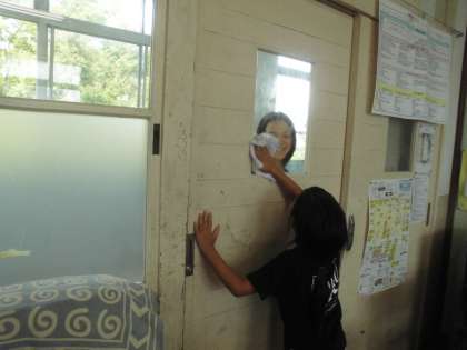 2学期も6年生と一緒に毎日がんばってそうじをしています。そんなそうじ時間に,とても仲良くそうじをしているペアを見つけました。教室の中と外から手の動きを合わせて窓ガラスをふいています。時々目が合うとお互いにっこり。窓ガラスはピカピカになりました。