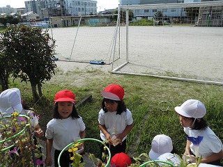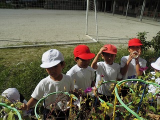 1時間目の体育の合同練習までに時間があったので,おしゃべりでんわを持って,アサガオとお話ししに行きました。