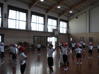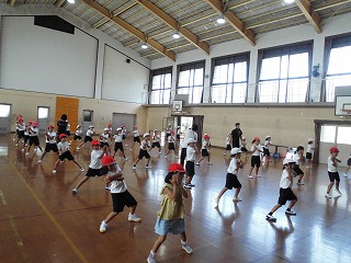2つのグループに分かれて,順番にいろいろなポーズをとっていくのですが,まずは音楽に合わせて間違わないで動けるように練習をしています。