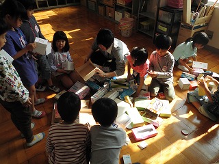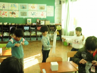 かさ袋と,生活科ルームにあった箱を材料をもとに,さまざまな飛び出す仕組みを子ども達が考えています。