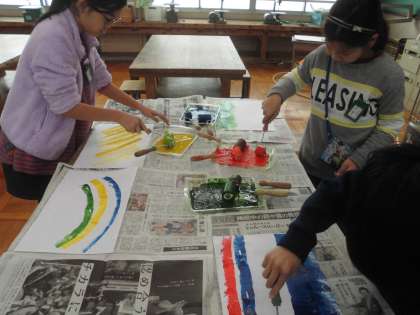うつす和紙にもカラーのインクで色をつけました。どんな作品に仕上がるか楽しみです。