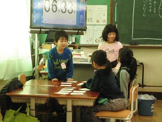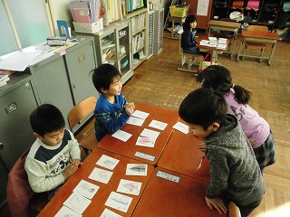 国語の時間に,魚や花などの言葉をかいたカードを集めてお店屋さんごっこをしました。
