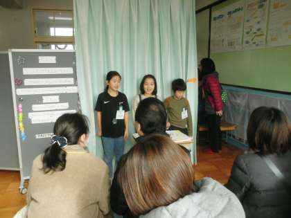 リラックス部では,お年よりのみなさんとふれあい,リラックスをしてもらおうということで肩もみと紙芝居をしました。紙芝居は国語科で学習し,3年生の心に残った『ちいちゃんのかげおくり』です。肩もみをしながらお客さんと話をする姿はとてもなごやかでした。