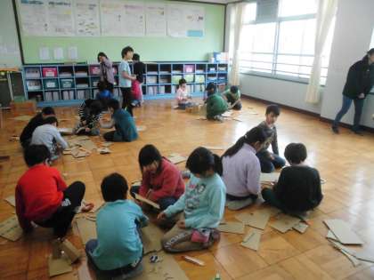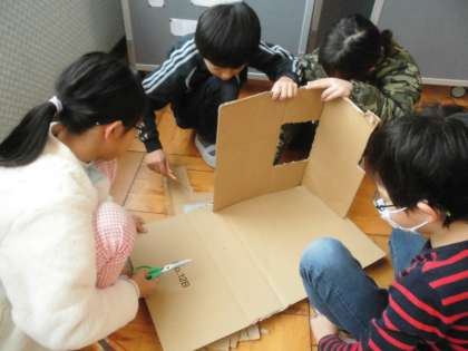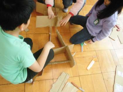 段ボールを使って学習をしました。今回の学習の条件は,「段ボールのみを使うこと」,「テープ類,のり,ボンドを使わないこと」「使ってよい道具はハサミと段ボールカッターのみであること」「グループで一つの作品を作ること」です。「えー!そんなことできるかなぁ?」と言っていた子どもたちですが,いざ作業を始めると,「切りこみを入れたらいいやん!」「差し込めるようにしたらいいんちゃう?」などと,次々とアイデアが出てきました。みるみるうちに楽しい作品ができました。子どもたちの発想力はすごい!と感心させられました。