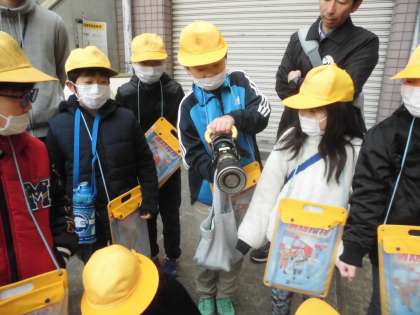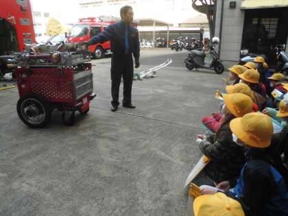 南消防署に社会見学に行きました。まずはポンプ車やはしご車を見せていただきました。放水するためのホースの仕組みについても教えてもらいました。見たことはあるけれど,間近で見るのは初めてという物がたくさんあり,興味津々の子どもたちでした。