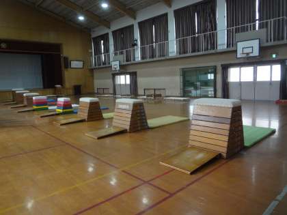みんなで協力して跳び箱,マット,踏切板を出しました。