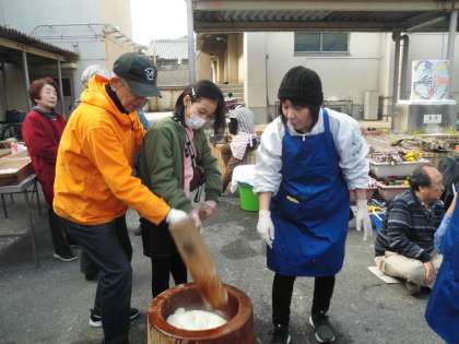 1月13日に九条中学校で「とんど焼き」がありました。餅つきなどに参加していた6年生です。