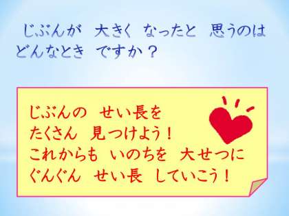 さて,きょうは みなさんが 「大きくなったな。」と 思うことを かんがえて みましょう。そして かんがえたことを おうちの人に つたえてみましょう。