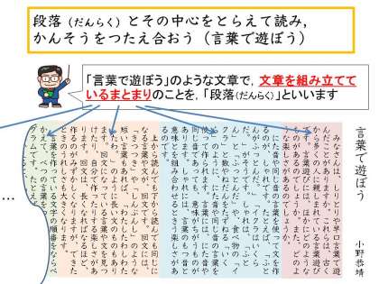 ここでは、「だんらく」についての学習をします。文章のないようだけでなく、どのように書かれているかを考えて読むことも大切です。
