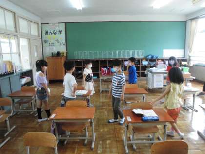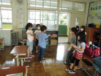 条件は「声を出さない」,「友達に触れない」です。この条件のもと,国語科の「じゅんばんにならぼう」の学習に挑戦してみました。本当なら声をかけ合って,誕生日の早い人から順番に並ぶのですが,できません。どうするかな?と思い見ていると,指で数字を表したり,友達を手招きで呼んだりし始めました。少しすると無事,並ぶことができました。子どもたちの工夫で「できない?」を「できる!」に変えることができました。これまでと違い,不自由なことが増えています。でも,それを「無理だから…」とあきらめるのではなく,様々な工夫で乗り越えていくことができます。柔軟な子どもたちの姿から学ぶことがたくさんありそうです。感染予防対策をしっかりしながら,みんなで楽しく学習していきたいです。