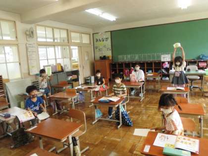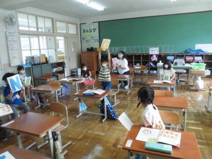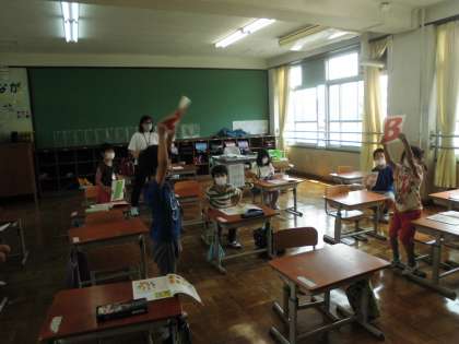 音楽の学習をしました。歌ったり,演奏したりすることが難しい中,リズムを感じながら曲を楽しみました。『子犬のビンゴ』では「B」「I」「N」「G」「O」のカードを曲に合わせて上げたり下げたりして楽しみました。