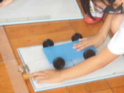 どうやら,ゴムをのばすときの長さ0の位置が人によってちがったり,走らせるときに手でおしてしまったりと,実験する時に気をつける条件がそろっていなかったようです。