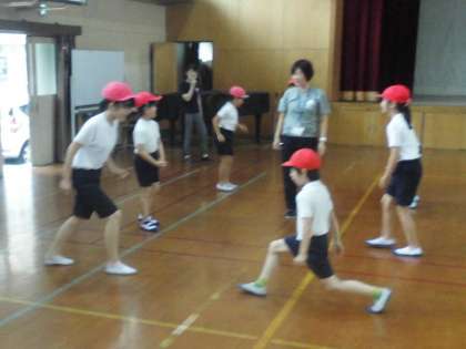 体ならしは,足じゃんけんです。足をつかったグー・チョキ・パーの動きが,両足で着地する動きにつながります。