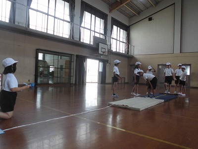 あいにくの雨のため,体育「はばとび」の2時間目は,体育館で行いました。