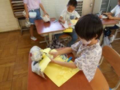 2年生は,「紙をくしゃくしゃにして 新聞紙につつみ,ひもでしばった後,友だちをつくろう。」というめあてで,学習しました。