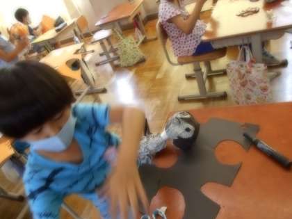次に,ひものしばりかたを工夫したり,色画用紙をはったりして,自分の作りたい友だちを仕上げていきました。