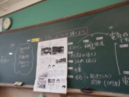まず,琵琶湖疏水のDVD(水力発電・インクライン)を視聴しながら,分かったことをメモし,その後副読本で,インクラインや水力発電について調べました。