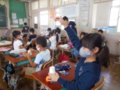 見本の仕組みを見て,作り方を聞いた後,各自仕組みづくりにチャレンジしました。なかなかうまく巻き上がらなくて,困っている子もいましたが、仕組みの完成した友だちに教えてもらうなど,教えあいの様子が見られました。