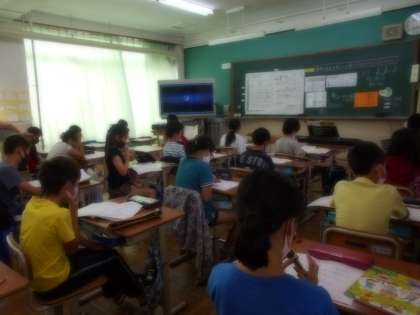その後,ゆっくりリコーダーで演奏する練習をしました。イの部分は,高いミの音(サミング)で始まりますが,みんな高い音もきれいに出して演奏できていました。