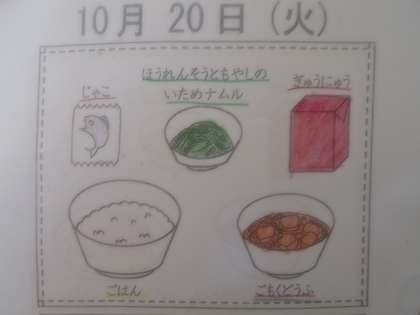 今日の給食は,「ご飯・牛乳・五目どうふ・ほうれん草ともやしのいためナムル・じゃこ」でした。