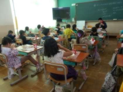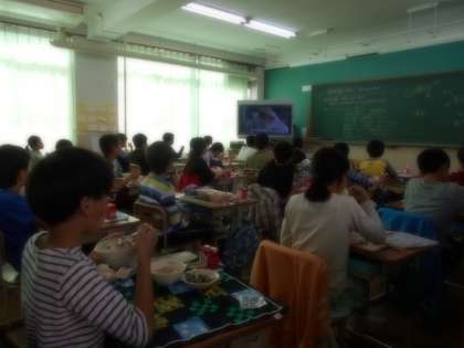 全校の子ども達は,テレビで「五目どうふ」「ほうれん草のナムル」を給食調理員さんが作っているビデオの映像を見ながら給食をいただきました。5年生は,「じゃこを細かくつぶしてふりかけにして食べるとおいしいよ。」「ほうれん草ともやしのいためナムルもおいしいよ。」1年生は,「じゃこをそのまま食べたらおいしいよ。いろいろな大きさの魚が入っているよ。」「じゃこごはんは,とてもおいしいよ。」「五目どうふもおいしいよ。」などいろいろお話してくれました。