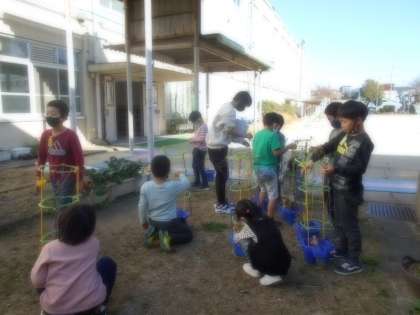 1年生は,生活科の学習で,支柱からアサガオのつるをはずす活動をしていました。「種がまだあるよ。」と言って,先生の持っている袋に入れに来る子,「なかなかつるがはずれない。」「○○さん手伝って」と言って,2人組で仲良くつるをはずす子などいろいろな様子が見られました。
