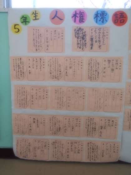 人権月間の取組で,人権標語を作成し,各クラスの前の廊下にけいじしてあります。