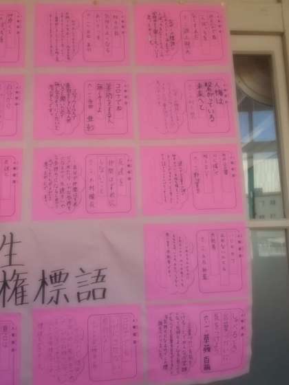 人権月間の取組で,人権標語を作成し,各クラスの前の廊下にけいじしてあります。
