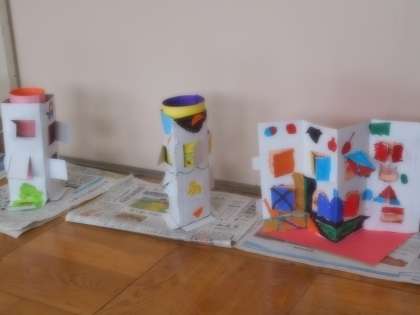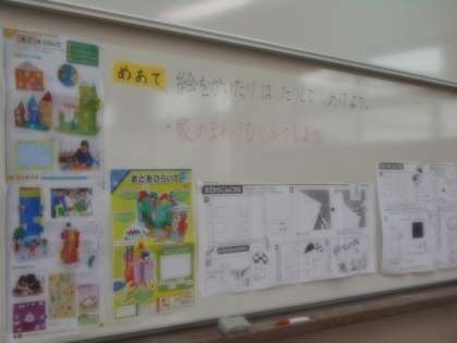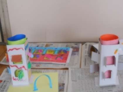 子どもたちは,窓から見える中の絵をかいたり,家の壁や窓をマジックでぬったり,色紙を貼ったりして,工夫して仕上げていました。家が出来上がると,家のまわりにあるものも考えて作っていました。