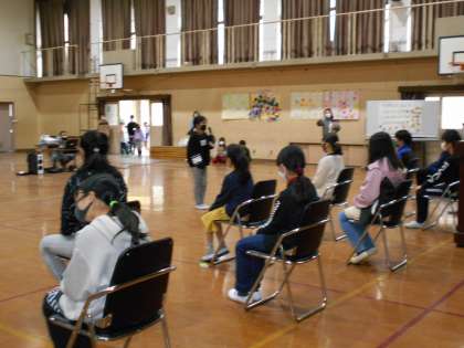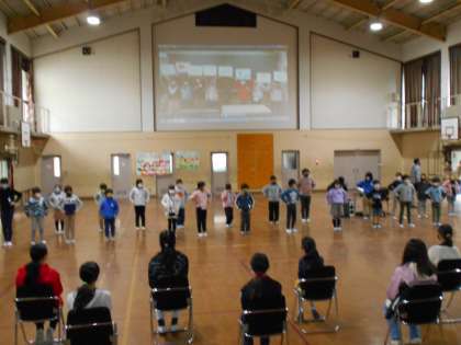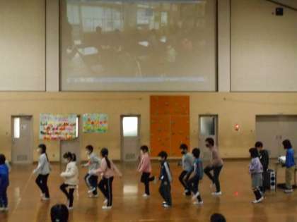 3年生は,6年生を送る会で,元気にダンスを踊っていました。後ろのスクリーンには