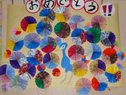 1年生は,クジャクの飾りを作りました。羽は一人一人が色紙を折って作っています。