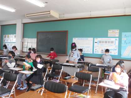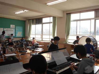 次に,楽器の担当を話し合って決め,パート練習をした後,CDの曲に合わせて練習しました。来週は,楽器の担当を変えて練習する予定です。