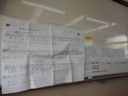 まず,鉄琴やキーボードの階名を書いたもの,大太鼓・タンブリンのリズム譜・小太鼓・カスタネットのリズム譜を黒板に掲示し,みんなで練習しました。子ども達にも,階名やリズム譜のワークシートを配りました。