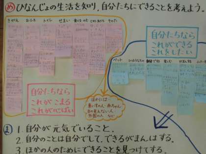 トイレや着替え,ぎゅうぎゅうのところで過ごすこと,などが困ることとしてあがりました。その一方で,自分のことは自分でする,できることは我慢する,赤ちゃんをあやしてあげる,などが自分にできることとしてあがりました。今回は「自分なら」ということで考えたのですが,話し合いの中では難聴の人は?車いすに乗った人は?目が見えない人は?と自分以外の人にも目を向けることができました。