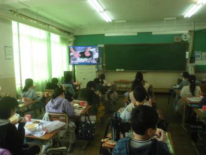 新しいテレビが入りました。4Kのテレビでこれまでより大きく,とても見やすいようで,子どもたちは感動していました。このテレビに教材を映しながら,使っていきたいと思います。この日は,給食の時に,給食室の様子を見ていました。給食室の様子をみながら,静かに感謝して食べました。