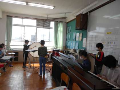 音楽室で,4年生になって学習したいろいろな曲を小さい声で歌ったり,鉄琴や木琴やオルガンで旋律を演奏したりしました。リコーダーも距離を開けて,久しぶりに演奏しました。最後は,大太鼓や小太鼓も入れて合奏しました。