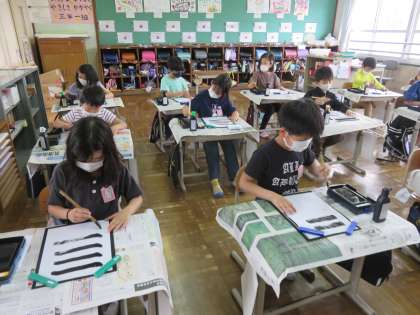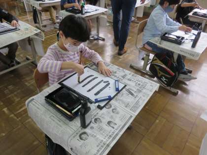 最後に,姿勢を正しくして筆を持ち,点を書いたりまっすぐな線を書いたりしました。