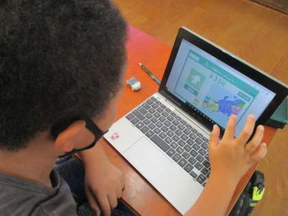 教室では,GIGA端末を使って,「都道府県クイズ」を楽しんでいます。都道府県の形や位置,県名をクイズ形式で覚えています。