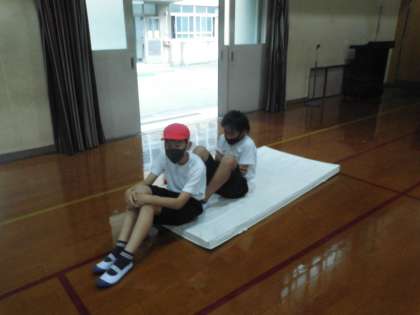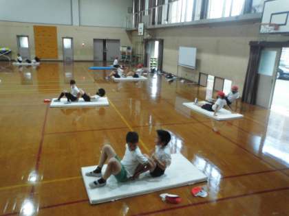 体力テストの一つ,「上体起こし」をしました。感染防止のために,向かい合わないようにして,体を押さえました。30秒の間に体を何回起こすことができるかを数えました。次の日は,筋肉痛かな?と思っていましたが,みんな全く筋肉痛にもならず,きっと日ごろからよく外遊びをしているから,体が鍛えられているのだと思います。
