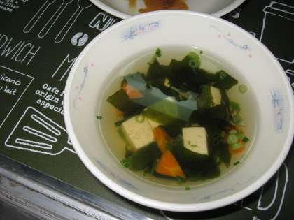 和食の基本には「五味」「五色」「五法」があります。今回は,すまし汁の実に「五色」(赤・青(緑)・黄・白・黒)をそろえました。赤はにんじん,青(緑)はねぎ,黄はえのき,白はとうふ,黒はわかめです。