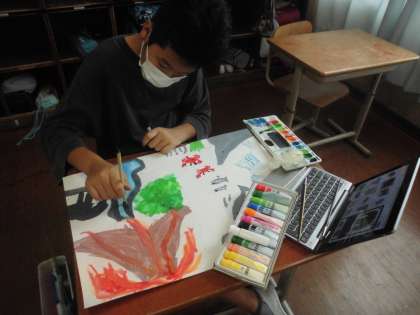 図工科「言葉から想像を広げて」の学習では、「よんひゃくまんさいのびわこさん」という絵本を読んで、想像を広げました。続きのお話を考えたり、その中でも心に残った場面を描いたりしました。スパッタリングやぼかしなどの技法も効果的に使いながら絵を描くことができました。