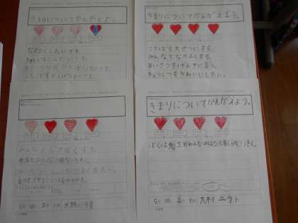 これから,「みんなでなかよくする。」「ことばを大切にする。」「あいさつをする。」「教室をきれいにする。」「進んでいいことをしていきたい。」「先生や友だちの話をしっかり聞きたい。」など,みんな前向きに思いを書いていました。